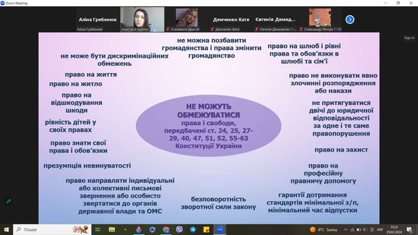 Під час заходу спікерка висвітлила поняття та види прав та обов'язків громадян. Особливу увагу студентка звернула на права громадян, які не можуть бути обмеженні під час воєнного стану. Вона надала детальну інформацію про права, які можуть бути звужені у зв’язку з воєнним станом.