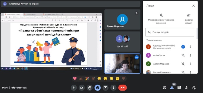 24 лютого 2023 року здобувачі освітньої програми «Право» першого (бакалаврського) рівня вищої освіти (студенти 4 курсу) факультету історії, бізнес-освіти та права, які проходять виробничу практику на базі юридичної клініки «Artium de Lex» ЦДУ ім. В. Винниченка провели правопросвітницький захід у дистанційному форматі на тему «Права та обов’язки неповнолітніх при затриманні поліцейськими» для учнів 9 класу Високобайрацької гімназії.