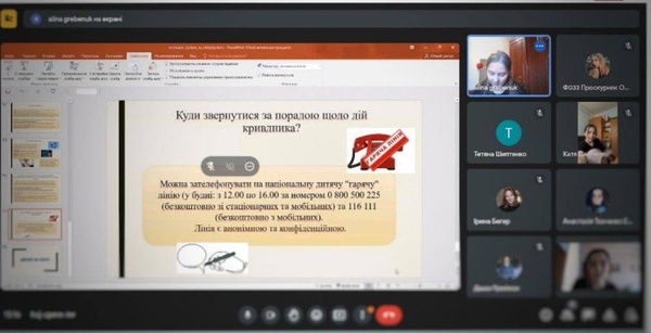 30 березня 2022 року студентки-консультантки юридичної клініки «Artium de lex» ЦДУ ім В. Винниченка провели правопросвітницький захід у дистанційному форматі на тему «Протидія булінгу та кібербулінгу» для учнів 11 класів Новоукраїнського ліцею № 4 Новоукраїнської міської ради. Спікерками заходу виступили Іщенко Анастасія та Гребенюк Аліна.