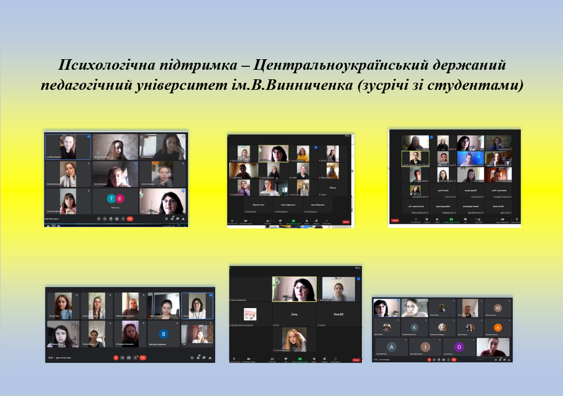 На базі психологічної служби ЦДПУ імені В. Винниченка сумісно з Комунальною установою «Міський центр професійного розвитку педагогічних працівників» Міської ради міста Кропивницького на платформі Google Meet була проведена рефлексивна зустріч практичних психологів навчальних закладів міста Кропивницького з проблеми: «Професійні труднощі: причини, аналіз та удосконалення організації роботи».